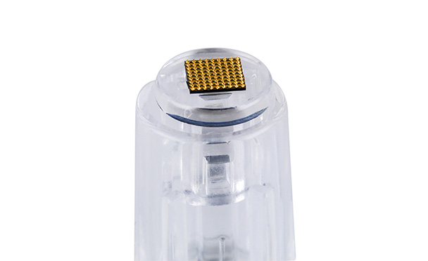 黃金納米微針是采用自主研發(fā)技術(shù)將99.96%的黃金材料結(jié)合99.999%的單晶硅材料,通過(guò)精細(xì)加雕刻的工藝將納米級(jí)別的針集成到晶片上,納米微針的頂部針尖小于60納米,相當(dāng)于普通針尖的千分之一,在數(shù)平方厘米晶片上有幾百個(gè)顆納米級(jí)別的微針,利用導(dǎo)入儀的均勻震動(dòng)頻率,純物理打開(kāi)皮膚通道,提高高達(dá)10倍以上的吸收效果,真正意義上一款無(wú)痛無(wú)創(chuàng),安全高效無(wú)副作用的高科技美容產(chǎn)品。